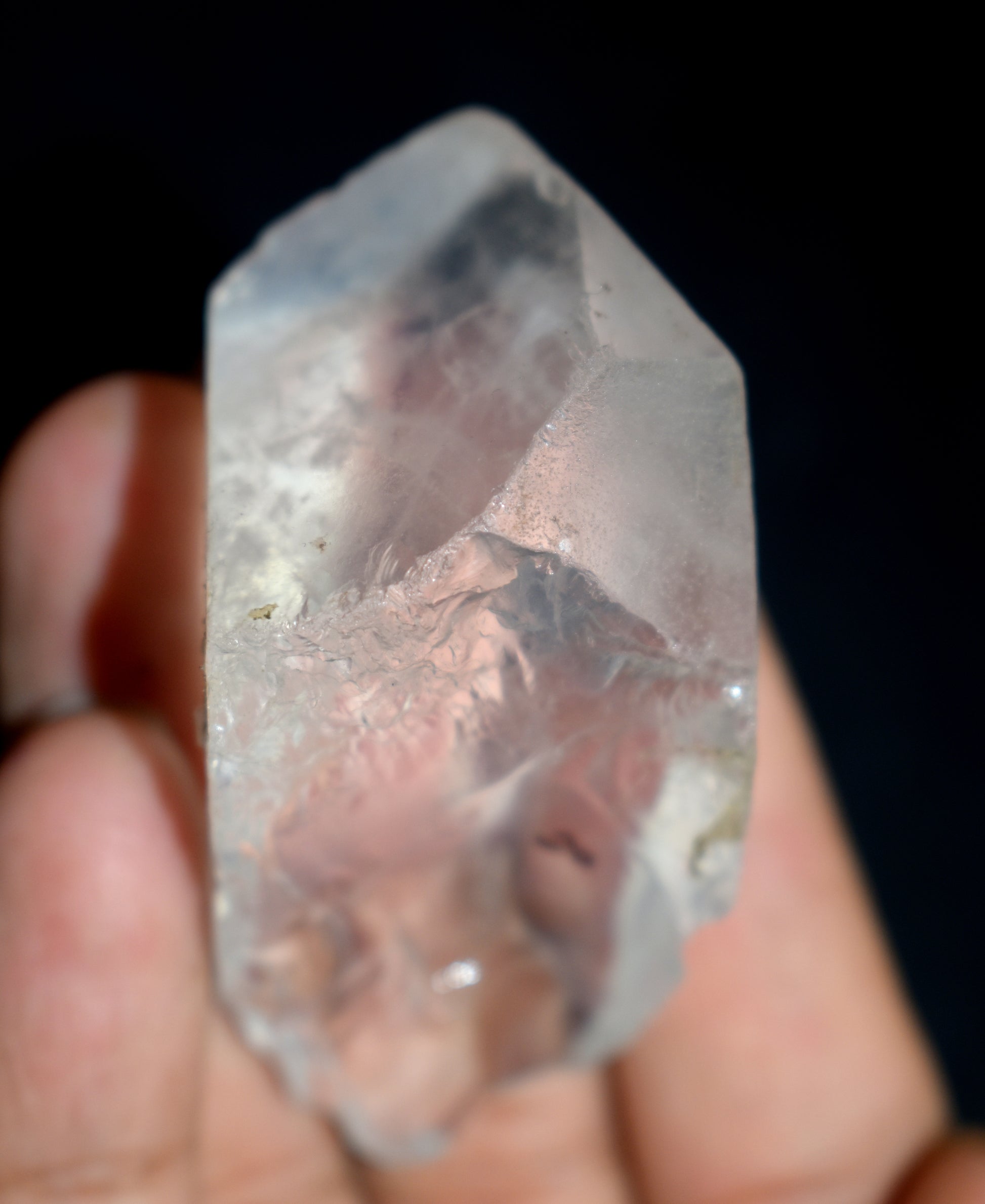 These crystals are usually clear quartz, often with a pinkish hue, and are recognized by the horizontal striations or “barcode-like” lines on one or more sides.