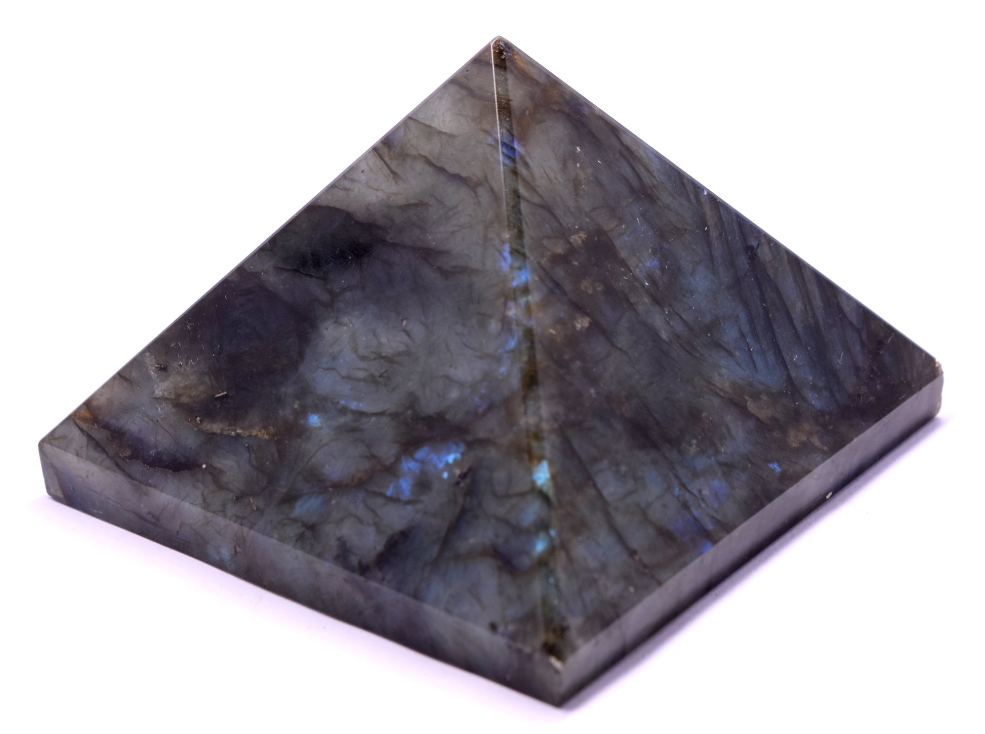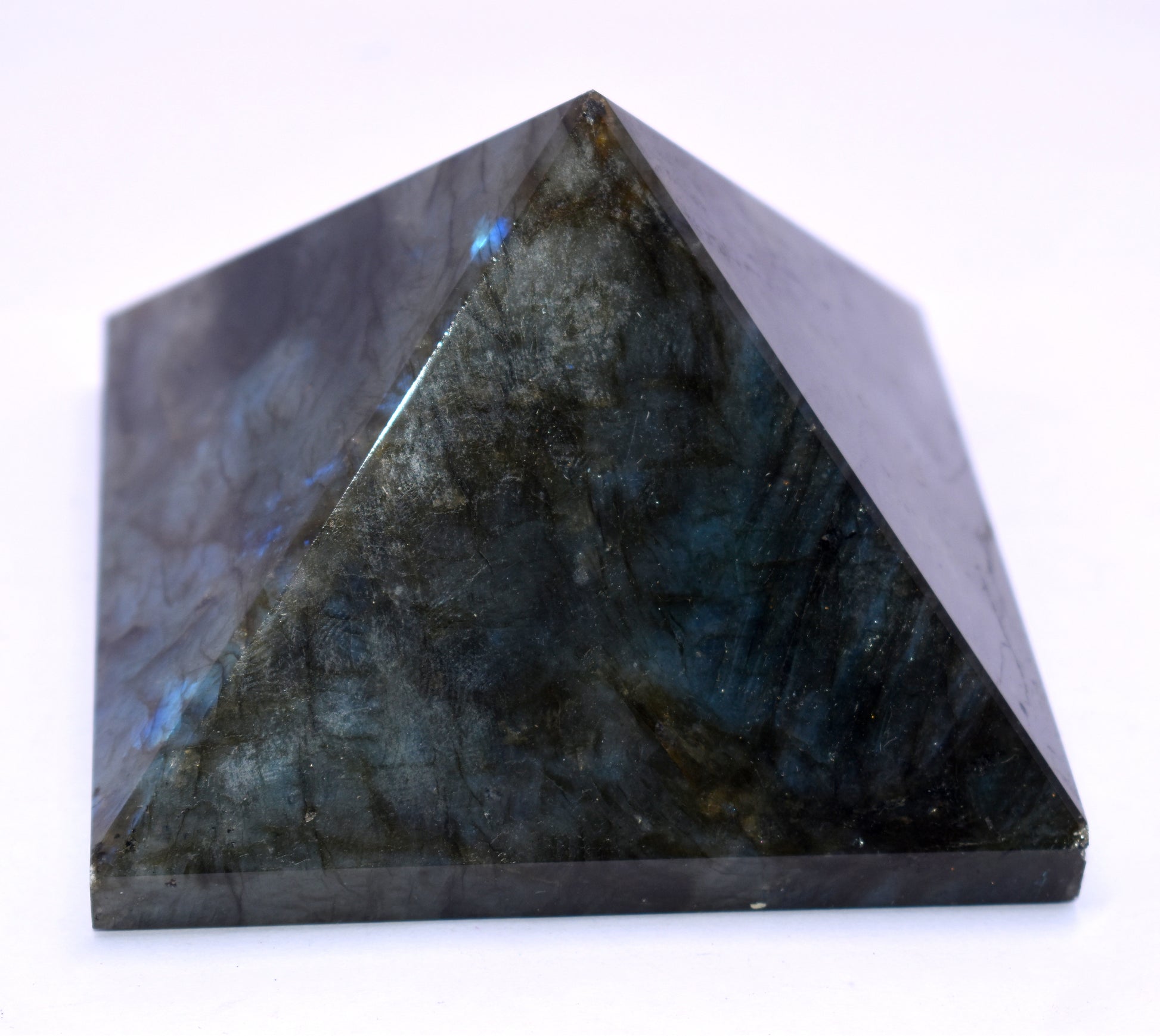 A Labradorite pyramid is typically carved into the shape of a pyramid, with its four triangular sides converging at a point. It is often used for spiritual and metaphysical purposes, believed to enhance intuition, psychic abilities, and provide protection. Many people use it for meditation, energy healing, or as a decorative piece in their homes or sacred spaces.