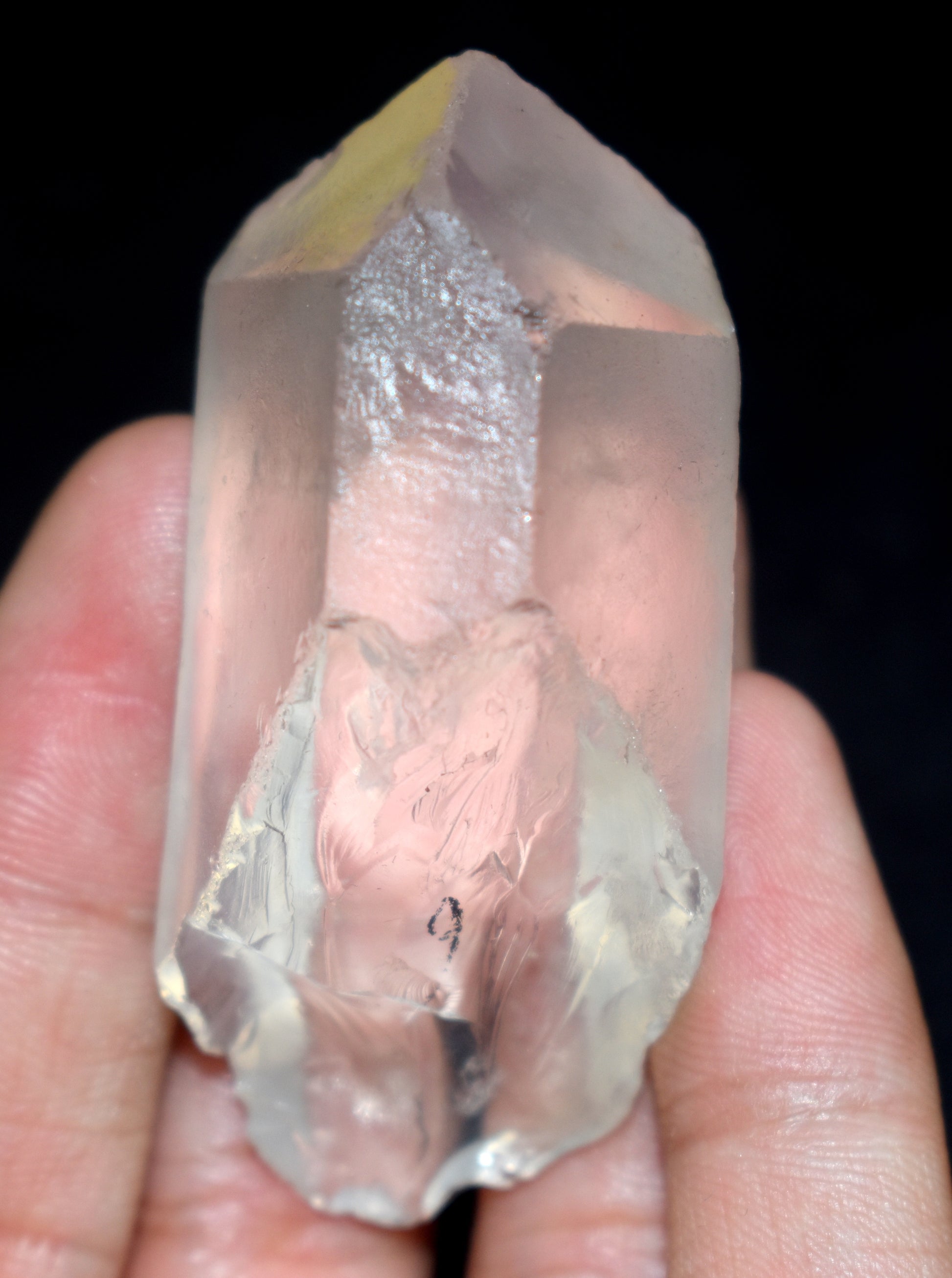 These crystals are usually clear quartz, often with a pinkish hue, and are recognized by the horizontal striations or “barcode-like” lines on one or more sides.