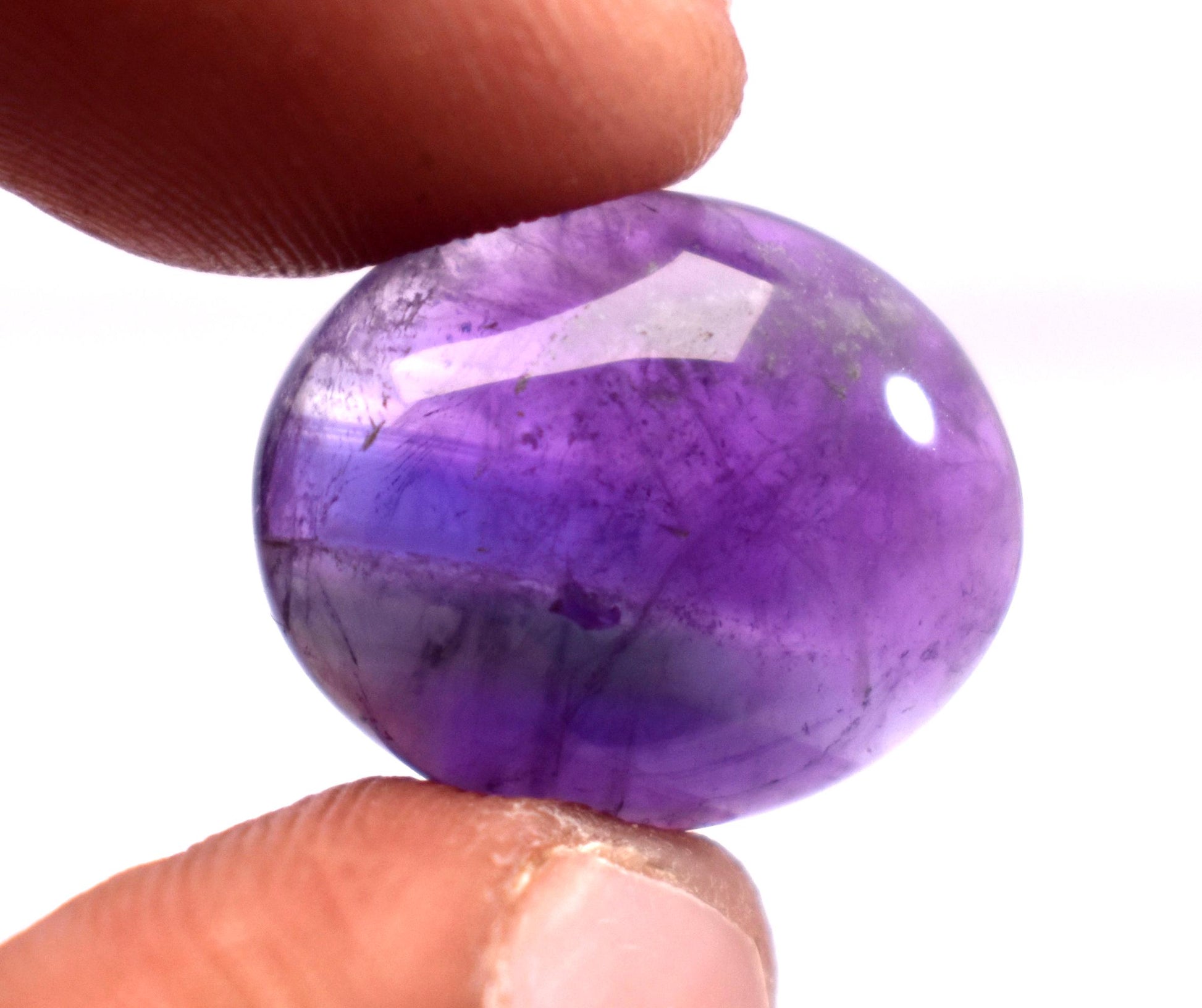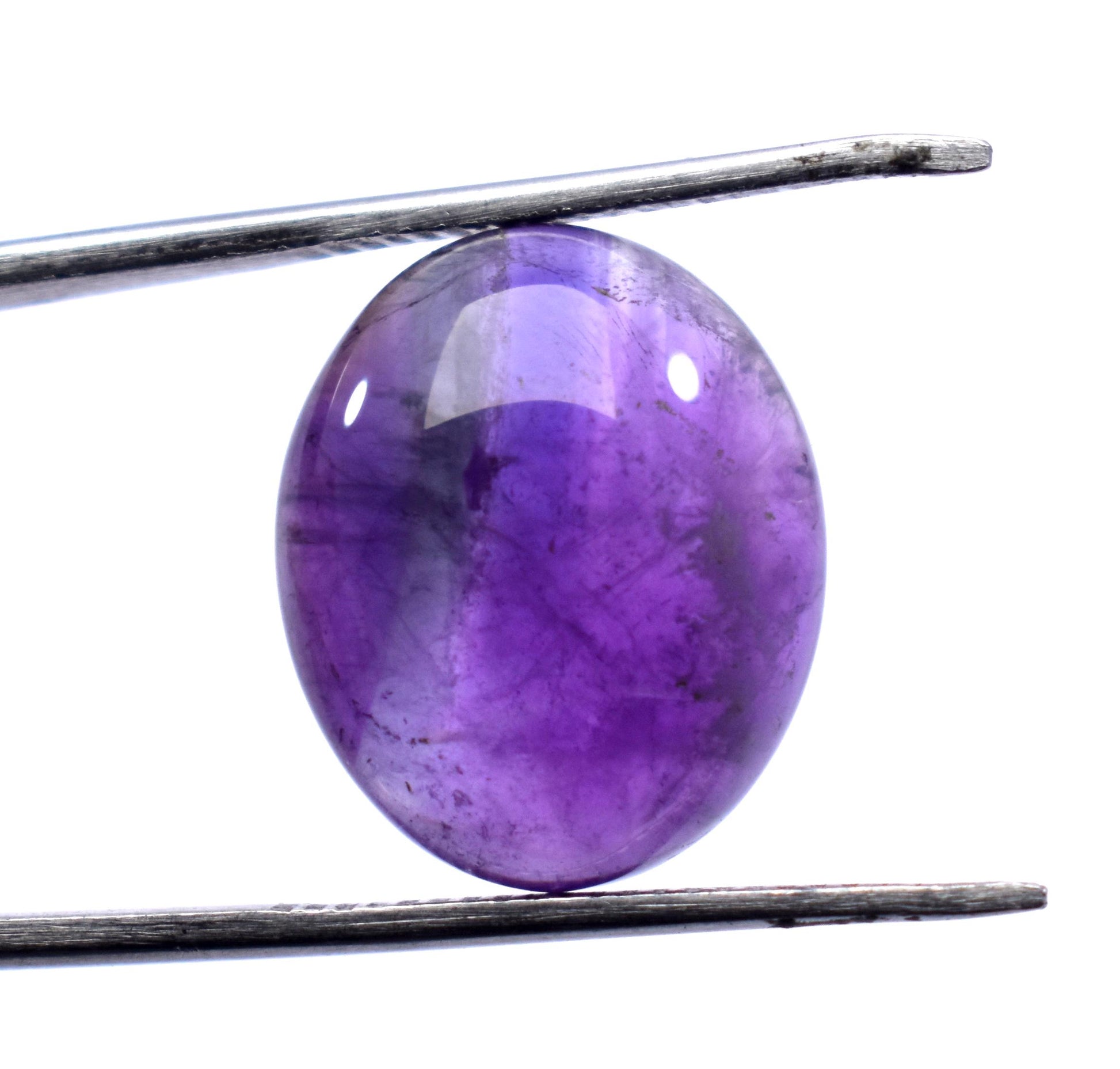 An amethyst cabochon refers to a polished, non-faceted gemstone made from amethyst, which is a purple variety of quartz. Instead of being cut with facets (like a typical gemstone in an engagement ring), cabochons have a smooth, rounded surface, often with a flat back. This style of cut is ideal for showing off the color, clarity, and internal characteristics of the stone.